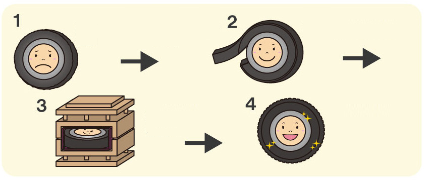 นำยางที่ใช้แล้วมาตรวจสอบสภาพที่โรงงาน SL ขั้นตอนแรก ตรวจสอบสภาพ เบื้องต้น และตรวจวัดขนาดตามมาตรฐานโรงงานแล้วจึงนำมาขัดเกลายาง ตบแต่งยางให้ได้ขนาดตามมาตรฐานนำมาโครงยางมาตรวจสอบอีกครั้ง เมื่อผ่านตามมาตรฐานจึงนำสู่กระบวนการผลิตต่อไป